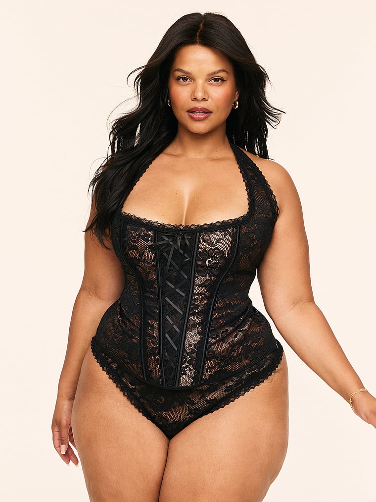 Made of sexy lace this dreamy Corset features halter-tie straps a side-seam zipper and a lace-up back for the ideal fit. A matching thong completes the look.