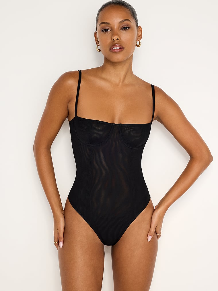 Double-layered mesh fabric hugs and smooths every curve in this bustier body suit crafted with high-cut legs and a sexy thong back.